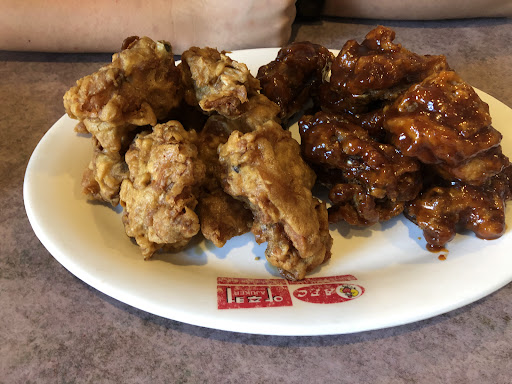 Read moreWent here with my son at about 7:30 on a Friday night. The restraint was fairly busy. We sat down at one at the booths. The cushions were very comfortable and bedded our bottoms quite nicely. The tables were clean and looked like they had been cleaned recently. We sat and decided what we were going to order for a couple of minute and we decided on the 1/2 Fried chicken 1/2 Soy chicken. We also ordered the kimchi pancake. The food came really fast. It came in only about 5 minutes. When it came, the waiter laid it on our table and we dug in! The chicken was nice and crispy. The flavor on the soy chicken was salty and a little sweet. The stickiness made it very nice. The fried chicken was very good also. The crisp made my mouth water when I bit into it. The temperature on the chicken was nice and hot but not too hot that it would burn your tongue and it would hurt for a couple of days. That would be a bummer. Me and my son found out that there was a shaker of pepper salt on the table. We figured that it would make the chicken taste better. And it did. It gave a even more saltier taste and a Little peppery taste. Now time to review that kimchi pancake. The kimchi pancake came to the table about 5 minute after the chicken did. The pancake was on a steaming hot dish that would give you 3rd degreee burns to the touch. We took our first bite and it tasted like squid but not as much kimchi as we thought it would. This was a little disappointing but it still tasted good. We figured that if you dip the pancake in the soy sauce sesame mixture that they had supplied us with, it would make it taste better. And it did. It gave a nice saucy salty flavor with a little sesame oil flavor. me and my son figured that if we put the chicken on the hot dish that the pancake was on, it would make the chicken much crispier. And it did. The service was good. The owner was very friendly and accommodating. When we were done, the got the leftovers in a box to take home. We went to play the bill, and noticed there was candy. Me and my son figured that if we took more candy each, we would have more candy, and we did. Thank you for listening to my review. Make sure to smash the...