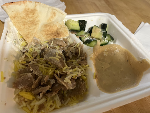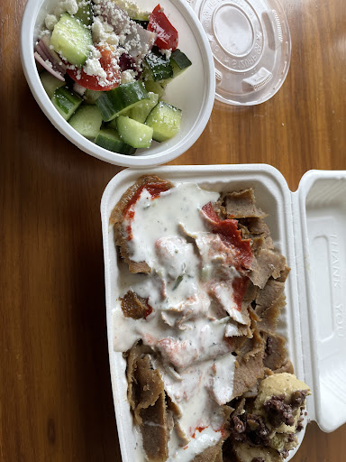 The food was meh and the "Greek salad" in particular was awful! A little bit of feta cheese and dressing and soggy cucumbers! Disgusting! Where were the peppers shown in their menu photos?! The rice was dry and a mix of white and yellow coloured basmati. The humous was runny and tasted awful - and I'm a huge fan of all types of humous normally.