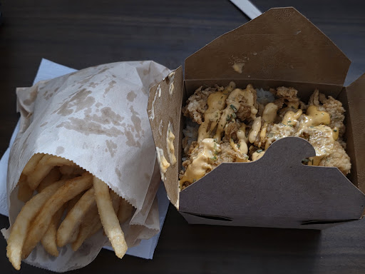 After ordering I stood for a while, then sat at the closest table next to the counter. After 30 minutes of waiting, I went up to check what's up. The employee told me they are making fresh rice and will be 10-15 more minutes. At this point I realized they forgot to make my order since I saw many tickets come and go. They offered some extra fries for the wait. 40 minutes wait is already pretty ridiculous but I get some fries.