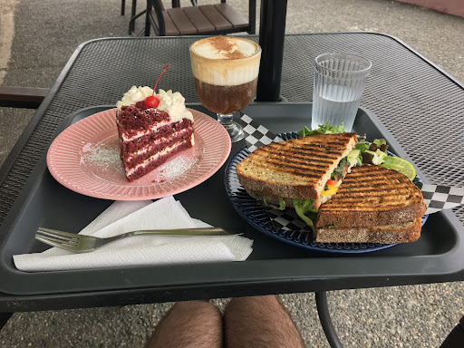 Read moreI loved everything here! The mood was so nice: the general noise level was low with relaxing music, and the cafe space is open and just effortlessly pretty (and it’s on the corner so there are two walls of windows, yay for natural light). The seating inside looked pretty comfortable, but I chose to sit at one of their two outdoor tables. Although their patio space is elevated away from the sidewalk so you have space, and their chairs are also comfortable, the ambiance just isn’t as pleasing as it is inside because the block isn’t the most scenic and it’s missing the music, but I’ll always choose outdoor seating and still enjoyed it out there! The people were so nice. I took a while to decide what I wanted and had a few questions about the drinks, and the barista was very sweet and patient. When I went back inside to bring my plates in before leaving, both of the baristas thanked me enthusiastically. They bring the food and drink to your table, and mine came out pretty quickly. I got the Veggies and Brie Panini, a slice of Red Velvet Cake, and an Einspänner. I’m usually more inclined towards tea and with so many tea drinks, it was a tough choice, but the Einspänner called to me and it was very nice! The sweet cream layer was very rich but the drink as a whole wasn’t too heavy and the sweetness to the cream was just a light touch to smooth everything out. Kind of a unique drink and I’d highly recommend it! The panini was also very good and a little bit different from the veggie paninis I usually get because it had fresh veggies instead of roasted, but I thought the crunch and brightness was nice. I really liked the herbiness of the sandwich. Also the dressing they used on the side salad was so good, it was kind of similar to the ginger dressing you get on the side salads you get at lots of Japanese restaurants, but more complex. The cake was a delicious way to end the meal! The cake was super fluffy and the cream cheese frosting wasn’t too sweet. Everything was very nicely presented but I thought the cake was especially pretty. The prices are reasonable for the portion sizes (which are neither particularly big or small) and the...