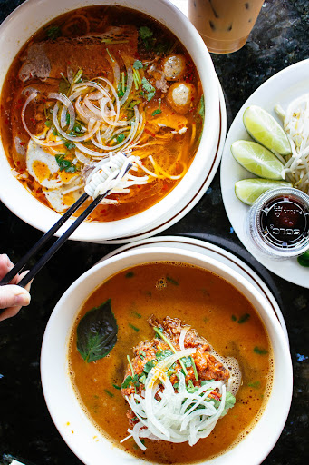 Bun Bo Hue (brisket, flank, viet ham, pork balls in a lemongrass beef broth w/ thick vermicelli) had a rich and flavourful broth, very good level of spiciness for me, and is amazing with a large squeeze of lime. Their lime/basil/beansprouts were also super fresh, and I was impressed (no leftover end pieces or wilting veggies). Honestly one of the best Bun Bo Hue broths I've ever had.