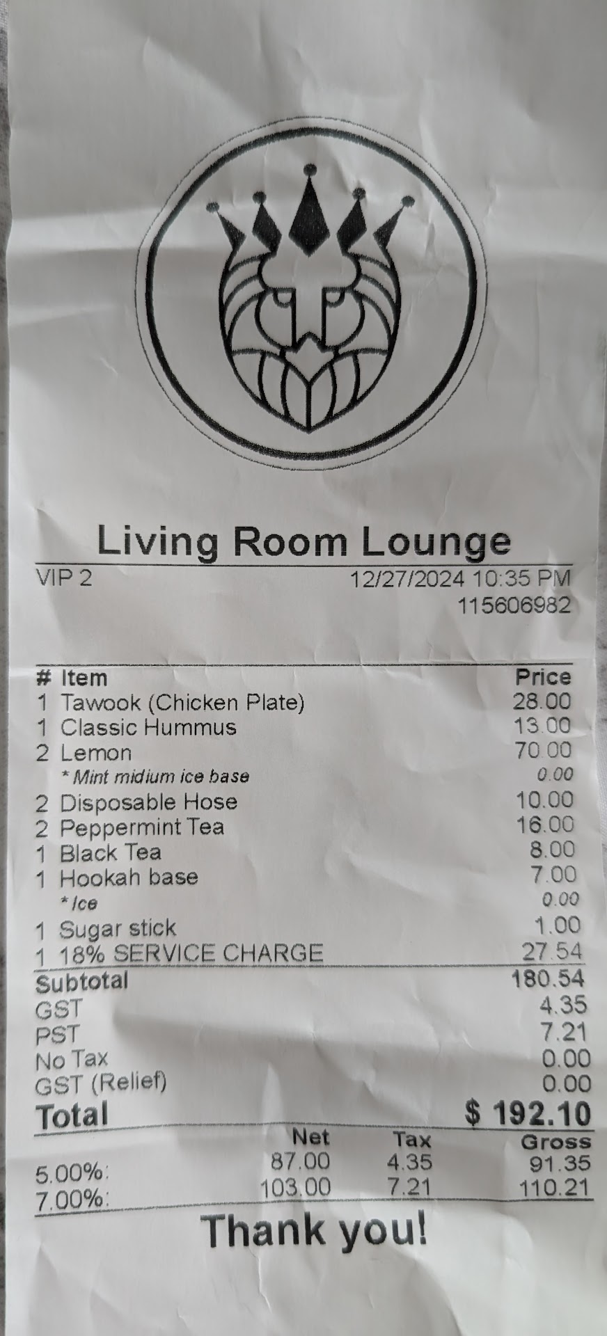 Final Thoughts: Hard Pass â 2/5 Living Room Hookah Lounge feels like a scam wrapped in pretty decor. Between the sneaky hidden charges, subpar food, and the audacity to ask for even more tips, I wouldnât recommend this place to anyone.