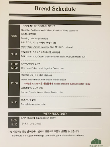 (Previous review was 4 stars) this place was hard to find, tucked away in the corner of a plaza adjacent to hannam market. We went around 1pm on Thursday and already they were out of a lot of their stuff. I’m not sure if it’s because of Covid, but they didn’t have any cakes/roll cakes. I wanted to try their mochi but they were out as well. We got a soboro chestnut bread, chocolate bread (ganache was divine!) and a chestnut bun. costed me little over $11. They ALL exceeded my expectations and I can’t wait to go back and try others. It would be a good idea to call and order in advance. There’s another bakery in the same plaza and if I were to compare them, Mr. Paris bakery is good, but taste factory-made and maison mori taste...
