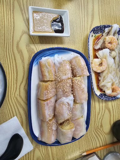 We ordered two congees, a rice roll with Chinese donut and rice roll with shrimp and scallop. The congee were okay, not the best congee but not the worst congee I've had. I do like that it came out piping hot and didn't get watery as I ate it. The rice rolls were definitely not worth it. The actual rice rolls itself were alright tasting but the filling was disappointing. The Chinese donut was one was definitely more worth than the shrimp and scallop, my only complaint about the Chinese donut is that it doesnt seem to be made fresh in house. The shrimp and scallop rice roll was almost laughable. It only had three shrimps and four small canned scallops and the server even took away the dish before we finished the last scallop so we only had three scallops. When I looked around at the other rice rolls people ordered, they too also lacked in fillings and barely had any. I think their rice rolls would be much better if they actually had a decent amount of fillings. I can order a rice roll at a dimsum place for $8-9 and its definitely more filled with protein.