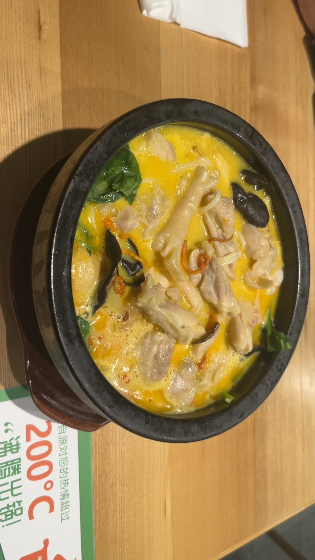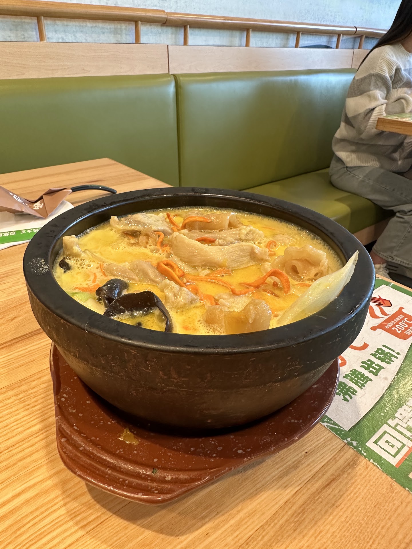 Champion pork bone broth rice noodle soup. The soup came extremely hot and it stayed hot throughout most of duration of the dining experience because of the pot it came in, therefore be careful. As for the ingredients, they all came with the basics; spam, spinach, fish tofu, quail egg, pickled veggies, choice of meat (beef, chicken, lamb, pork), tofu skin, corn, fungus. I added a fried egg on top. As for the pork bone broth, it was tasty! Fish maw and chicken broth noodle soup. Everything was the same, just different broth. The broth itself was okay but I personally preferred the pork bone broth more.