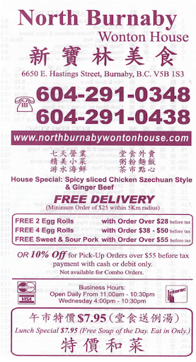 Read moreMy co-worker and I had a quick lunch at North Burnaby Wonton House. It was my first time having food at this place. We had a great time there. We arrived at the restaurant around 11:45 am. The restaurant was just open. It was not busy. We found a table and set down to order the food. North Burnaby Wonton House is a small family based Chinese restaurant. Inside the restaurant, it’s a traditional Chinese style setting and decoration. There are three different kinds of the menu for this place, Lunch Special, Dinner menu, and take out the menu. We ordered food from its Lunch Special Menu since it’s very cheap: All the food on the menu are $6.95 OR $7.95 with soup, which is such a great deal.