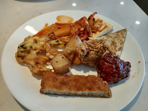 Highlights: -Tteokbokki was very spicy, chewy and had large yummy fish cakes mixed throughout. -Their Tofu with Kimchi was very well marinated while not being too spicy. Went well with hard tofu. -They had Sweet roasted Potato pieces which were very good. -There was this tempura -like vegetable which was super crispy and flavourful. It had many thinly sliced vegetables lightly battered then fried. -The Tonkatsu pieces were lightly battered, crispy, very thick and meaty/juicy. It had a light semi-sweet savoury sauce that was amazing! It reminded me of the gravy you get on cutlets at Dae Ji Cutlet House. -Both the sweet and spicy and regular fried chicken were amazing! They were lightly battered, super meaty and juicy. The glaze for the spicy one was more sweet so I preferred the regular one. -Teriyaki salmon was very thick cut, juicy and tasty. -Fried flounder was definitely the star. It was lightly battered and salted but it was so crispy and juicy. Although there were bones, they just fell right out from the thick chunks of meat when pulled. -The jellyfish salad was nice and crunchy, sour, and had a hint of horseradish. -The cold kimchi and spicy squid salad were stars. The kimchi was crunchy, well marinated and surprisingly not too spicy while still being flavourful. The squid was very tender. -Didn't try California roll, but the Kim Bap was tightly wrapped, had tasty rice and crunchy marinated filling. -Dumplings were crispy and juicy with lots of filling. -Squash soup was very creamy and sweet. -Soft tofu soup was amazing! It was very hearty, had lots of tofu and melon and was super savoury.