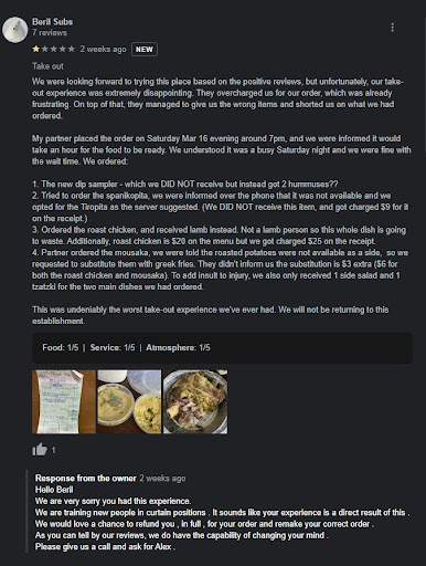 Read moreSocrates has been our go to restaurant when craving Greek food for a good amount of years now, but tonight’s experience was an absolute lowest of the lows. I called the restaurant to place a pick up order at 4:54pm, the lady on the phone said half an hour. My daughter showed up to pick up at 5:35, food was not ready, and was told a few mins more, okay that’s fine… 5:45/5:50 came around, no food so my daughter let me know that the lady was asking what the order was and the name several times. I decided to call the place myself and speak with her, explained to her the situation, were told half an hour it’s been an hour and still no food, she quickly responds yea yea I check what’s going on and HUNG UP THE PHONE!! Really?! So I called back after texting my daughter to see if the food was ready yet, NOTHING! I call again and ask to speak with her manager this time, first tells me she is the manager and then laughs and says she is not the manager. I asked her if she could apply some sort of discount for the inconvenience of waiting so long (plus having food ordered at another local restaurant sitting there getting cold!) she was so quick to respond something about me not knowing anything about business and that I would receive a discount but she would not be taking another order from me. Absolute TRASH of customer service. It was rude and unnecessary. The food was handed to my daughter at 6:04pm! The kitchen man even confirmed with her soon after that she should not have said half an hour knowing very well that it would not be ready in half an hour (my daughter heard it all!) Needless to say, it was a very unpleasant experience with Socrates tonight, which is very unfortunate as we have been very faithful customers for many years because their food is delicious. We will have to find another I guess, as she will QUOTE “no longer take...
