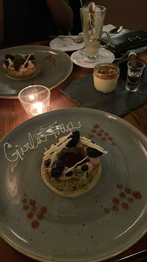Main course: Husband- bison, leek and potatos (2 tiny ball roasted potatos) Extremely salty, uneatable amount of salt. Me- pasta, 45 dollars for 5 tortallinies... okay if they were large and exquisite but no...tasteless, ricotta cheese filling was definetly reheated pasta is not "made fresh everyday" like they said...no way I can be convinced of that as an italian who makes her own pasta! The "garnish" tasted like gone bad spinach/greens. I couldn't believe it. Dessert- it was okay, not worth $18 each!!