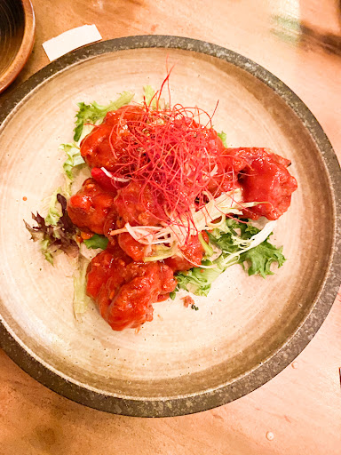 The udon carbonara read well on the menu. Upon its arrival in a stone bowl, bubbling away— we were all very excited to dive in. My 10 year old is a fan of creamy/ rich dishes but after 3 bites she gave up. Noodle texture was lovely but it was drowning in a VERY rich sauce. The dish could certainly benefit from some sort of acidic garnish to help cut thru the richness. At this point, my dinner guest and I were still hungry after our 3 dishes, so we were waiting on the hell’s chicken, however, after two bites of the carbonara— the heaviness of the carbonara made me not want to eat anything else.