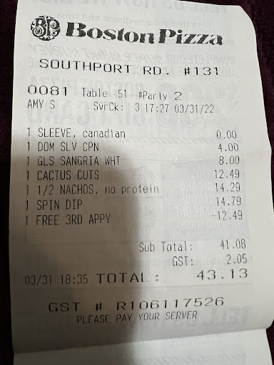 Read moreI have not been to Boston Pizza in years, and I have not eaten in a restaurant since 2019. My partner and I are both quite cautious about eating in public even this far into the new normal of covid. Dakota, the manager, was absolutely supportive and wonderfully accommodating. He was willing to do whatever he could to ensure our dining experience would be enjoyable. My favourite bit was when he reminded me WHICH Boston Pizza location I was ordering from. Apparently customers often order from one location but go to pick up their order from another! And then there's the food! My partner and I love a good pasta meal, so we went with the Baked 7-cheese Ravioli and the Hungry Carnivore (spaghetti, not penne). The portions are HUGE; we typically have to take a bit of the meal home when we dine out, but wow! My partner ate maybe a third of the serving, and was delighted to have two 'leftover' meals for later. The sausage in my pasta was delightfully spicy, and the meatballs actually tasted like BEEF. The food was great, and if you've eaten at a good family restaurant you can probably picture the sort of food I'm talking about. However, the service truly set this place apart for me. Whether you are ready to dine out again or would rather do takeaway I strongly recommend this restaurant...