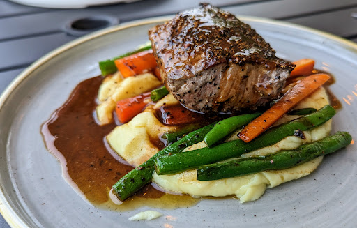 The steak was perfectly cooked, the pan pepper sauce was delicious. Veggies were perfectly tender, crisp.