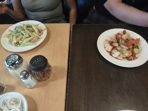 First of all, I was shocked at how disorganized the service was. We sat outside, and initially we were seated by 1 server, then a teenage server followed not long after who brought us some bread and asked if we would like some oil and vinegar with it. When asked what kind of oil it was, he said “I’m not sure.” I had to say “probably olive oil”, to which he agreed. Then our main server came out to check on us and get us drinks. By the time we were brought oil and vinegar, we still did not have utensils, but minutes later our main server brought them. We had different people bringing us our 2 appetizers (Caesar salad and calamari), and a different person bring us our mains. I never had the meaning of having 1 server so lost at a ‘service’ as was the case with this. We saw other tables get offered chili peppers and Parmesan cheese, but that was not the case for us. The calamari was like rubber, and the bread was falling right off. The Caesar salad tasted like it had store bought/boxed croutons. The portion sizes of the mains (a Sicilian pasta and Napoletana spaghetti) were abysmal. I had to poke around with my fork to find the small bits of dry/dehydrated sausage in the Sicilian. Given the bland taste and that the sauce tasted like it was days old/leftovers reheated from the fridge, maybe under the circumstances it wasn’t a bad thing that portions were small, since our stomachs were churning. The server was nowhere to be seen for a prolonged period of time (most of our time there honestly) and it took talking to 3 different staff inside the restaurant until we could final settle up our bill and get out. What blew my mind was that the place had a decent turnout of customers. Yet it’s like they have too many staff working the evening shift that they all maybe feel the need to share tables amongst each other just to keep...