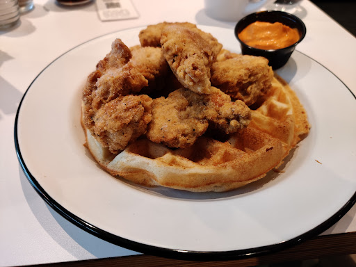 Ā Ā Ā Read moreI came here with some expectations based on the interesting menu and reviews. The menu is very good. It not a large menu with balance. The names of the dishes are catchy. The venue is nice and welcoming. The staff are polite and friendly as expected in Canada. I ordered a cappuccino with waffle and fried chicken. The coffee came instantly so I believe it must have been from a machine. The quality of the coffee was average. The cup size was large as you can see from image, so they were generous with the quantity. To my taste the cappuccino tasted more like a latte it was very milky. Right after having this coffee I walked across the street to Phils and Sebastian and had cappuccino there and I experience a big difference in the quality of the coffee. Waffles and fried chicken I have tried a lot in the states in places like north Carolina, NYC, bay area and Texas. So my judgement could be slightly bias as I experienced some really large size chicken servings cooked in southern style with some tasty seasoning red or orange color crispy battery skin buttery with syrup drizzle on top with the thick waffles spongy inside and crispy outside. Everything was freshly made. The fried chicken here was breast with a very mild seasoning. The breast was dry inside and you taste more of the marination and coating than the chicken meat itself. That was in contrast to the chickens I had in the states. The chicken in the states where southern fried chicken that were definitely nicely brined and marinated giving nice juicy chicken meat. The chicken were whole pieces of thighs or beast with bone and skin. You get the nice crispy chicken skin. All these elements of a good fried chicken was missing. The chicken here almost tasted as though it was from a ready made package. Waffles also average at best. The waffles also tasted like the ones that were ready made package. This is a restaurant at back if alt hotel downtown, I expected more high quality preparation. I am surprised by the rating of 4.1 currently for this place. I may have missed on the other good dishes perhaps. I am in dilemma to go back or not again. Chicken and waffles is a classic breakfast dish. It is not that difficult to get right. But the chicken and waffle was average at best. I would give it a 2.5 rating for this specific dish and coffee. With a little bit more effort this dish can be better prepared. My overall rating is 3/5 including food , venue and experience. I recommend the cook study some chicken and waffle recipes on YouTube to get ideas how to improve this...