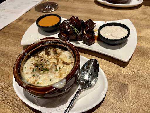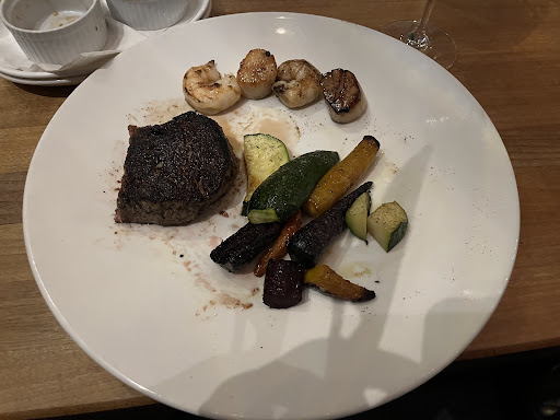 Read moreHad a decent time with food that I probably wouldn't order again, but that's more on me than the restaurant. My notes: Starters: Ahi Tuna Tataki and the Escargot Stuffed Mushrooms. The Ahi Tuna was pretty good but I felt it lacked a bit of punch. A bit more lime probably would've done it for me. The julienne vegetable and edamame beans(?) as the base were pretty tasteless. The Escargot had a nice crisp bread crumb on top, but I felt were pretty bland and lacked flavour. Mains: Smoked Rib Eye with Loaded Mashed Potatoes and Top Sirloin with Garlic Shrimp and French Fries (Surf & Turf). The smoked rib eye seemed like a novel item, and it is, but it just isn't for me. The smoky flavour just isn't up my alley. That's not to say that it isn't good and wouldn't suit others well, just not me. The loaded mashed potatoes were quite good and didn't feel heavy at all, but I would've added more sour cream to help cut the heaviness of the steak, but that's a personal preference and I understand how difficult doing a template "loaded" potato dish can be considering how varied preferences can be across the board unless you're actually bringing out the tray of toppings to do it individually per customer preferences. The garlic shrimp were pretty good not nothing special, same with the top sirloin. A pretty basic surf and turf. The french fries were also very plain with no seasoning. *Special note, the peppercorn sauce is made with brandy in case there's an aversion to alcohol (alcohol is cooked off, but still). Desserts: Flourless Chocolate Torte and New York Cheesecake. The chocolate torte seemed pretty standard, nothing really stand out about it, but it was quite good. The cheesecake was also quite good, but it notes that it's supposed to be infused with ice wine and ginger and I couldn't taste either. Perhaps a little disappointed by that.