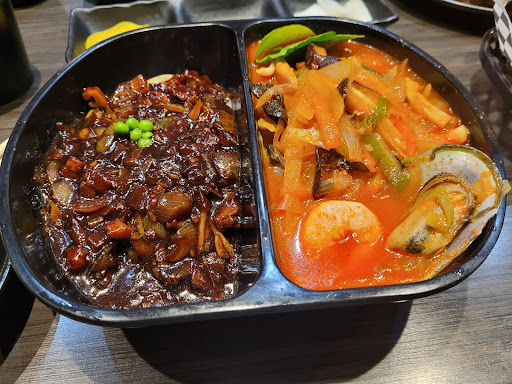 This was my 2nd time trying Chun Jang. The 1st time, I was so disappointed by their black bean noodle, I made a promise not to come back, however, a good friend recently went and said it tasted different and the. food quality has changed. So, my husband and I gave it a try today. I must say the black bean noodle was actually not bad. The sweet and sour pork was really good! It was chewy and savoury. We were very pleasantly surprised. The jjampong though was a disappointment. Barely any seafood and the soup lacked flavor. It tasted heaby with ground peppers. The quanity was on the smaller side because my husband and I were not full after the meal. Also, they cheap out on the side dishes by giving like 4 pieces of onion at a time. San Dong Ban Jeom is my favourite black bean noodle place in Calgary still and when we order the classic combo, we have left overs because we get sooo full. Chun Jang is just closer to home, but I would still drive further to go to San Dong Ban Jeom. I hope Chun Jang can work on their food a bit more and improve and be a bit more lenient...