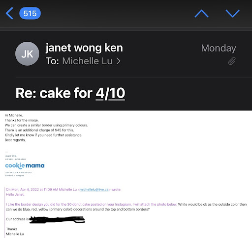 I ordered a custom cake for my sons first birthday, we had communicated through email about the design and color of the cake. When I went to pick it up it was not what I asked for at all. I asked for a white cake with red, blue, yellow decorations. I got a teal, purple, yellow, blue cake. I will attach the emails which clearly states what a I want and the owner agreeing to it. The owner was so defensive when I brought up that it was the wrong color. She charged me an extra $45 dollars to pipe on the wrong color border, blamed me for it saying I was not clear in what I asked for and did not offer to fix the problem at all. I had my 1 year old with me so did not want to make a big deal at the store but I’m so disappointed his first birthday cake is not going to match the color theme for his birthday pictures.