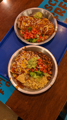 Smothering burritos with sauce like enchiladas is definitely a different twist. got it with a fork and knife unlike other burrito places we can actually pick it up slap in your mouth like street food that's going out the window here. You have to offer what it is which is fork and knife sloppy messy saucy bye-bye crispy.