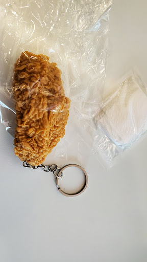 I brought my order back to my office and was surprised to find 3 food containers and several ancillary pieces, the first of which I thought was an individually wrapped breaded and deep fried chicken wing, but it was actually a key ring that looked realistically like a chicken wing. That was nearly worth the price of admission and made a few office mates envious. The first food container had, not 5, but 9 chicken wings, the next food container contained a green salad with Caesar dressing, and a third container had my steak sandwich.