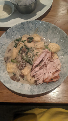Read moreMusic played is upbeat low energy and club-like with occasional pop mixed in that matched the vibe, very nice and soothing! lighting is very nice, dim yellow, feels warm while soft on the eyes. very clean, I saw staff wiping down tables the moment people left. many patrons, very lively! there is also wifi. overall, amazing atmosphere! When ordering everything is very customizable and flexible, such as adding grilled chicken (which was incredibly tender and juicy) to my tortellini. Servers from other tables would grab finished plates as they passed, so clearing the table was very efficient. A water pitcher was provided with lemons in a dish to add to your glass. Servers were very nice and communicated if they were busy or not. they remained helpful during the entire experience. So service was a definite 5 stars. ALL THE FOOD WE ORDERED WAS AMAZING! everything was very flavourful, and cooked to perfection. The truffle dishes like the fries in particular were incredible! their sauces like soups, chowder, and the truffle tortellini were packed with flavor and creamy, amazing texture and taste. I was literally scraping my plate with a spoon. their dry seasonings like the fries are also to die for! and for desert I ordered the cheese cake, very average, but great. Overall amazing experience I cannot recommend this place enough! Pictures provided don't do the food service, many orange hues are weakened, just trust me that they...