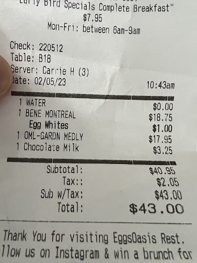 Read moreWe had some family visiting from the East Coast and they wanted to go to Eggs Oasis in Crowfoot for breakfast. The place was quite busy when we entered and that is usually a good sign. Savanna, our server, was very pleasant and did a great job even though you could see she was very busy. After an extended wait for our breakfasts (30-40 minutes) the food arrived. Three of the four breakfasts were cold. The toast was cold and rock hard. After checking the rest of the food, I called Savanna to come over and told her the food was cold. She apologized and took our plates. She asked if we wanted it redone, but I told her we did not have time to wait for another extended period. A few minutes later she returned and told us that the manager said we would "only" have to pay half price. I was surprised that they would charge us anything considering most of the food was untouched. I requested to see the manager. About 5 minutes later, Savanna returned to our table and told us that the manager (her name was Anjanna) would not come talk to us. I was shocked! This is the first time I had ever seen something like this. I asked Savanna to go back and ask her once again. Savanna came back about 5 minutes later and told us that Anjanna would not come out and that we could leave but Savanna would have to pay for the breakfast. Naturally, we did not want the server to be stuck with the bill so I asked her to provide me with the name and numbers of Anjanna's boss. She returned once again with the name and number but the manager would still not come out. We ended up paying for two of the four breakfasts (only one was eaten). Savanna apologized once again and we were told that there was only one cook in the kitchen, but I am sorry, that is not an excuse to serve cold food. In the parking lot, I called the boss (his name was Aman). He told me that the server usually deals with customer issues and the manager may have been busy. I told him that we had made the request a number of times and he told me that he would look into it and get back to me within the hour. That was three weeks ago. I will never again go to any Eggs Oasis, as, if this is their idea of customer service, and they are not willing to stand behind their product, there are many other breakfast places that have great customer service and only want the customer to be satisfied. Great job Savanna, very poor job Eggs...