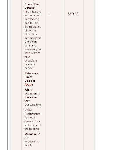 The chocolate cake, however. I asked for our initials, A & A, in interlocking hearts. I attached a reference photo of how I wanted the hearts to look. And the cake was made with the interlocking hearts, but also with the message "A A in interlocking hearts" WRITTEN ON THE CAKE 😭😭😭😭😭😭😭😭😭
