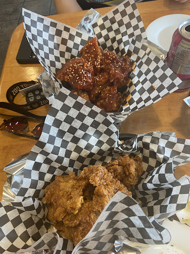 Read moreWe ordered what we typically would order from other Korean style fried chicken places. We were surprised to see that the serving sizes were larger than those of their competitors, the individual pieces of fried chicken felt larger. The chicken was crispy, just the way we like it. We ordered the original and normally that'd be a safe choice for us. However, it was way spicier than we expected. The heat kept building and building with each bite you took. If you are spice intolerant, proceed with caution. We don't typical eat spicy, but can tolerate a bit. The flavour was still delicious. We also ordered pickled radish, but I think you get some with the chicken anyways. No loss on us, we love pickled radish. We also tried the sotteok. It was made to perfection. The rice cakes were crispy yet chewy. The hotdog saltiness and the bland rice cake were perfect for each other. We loved both and will be back.