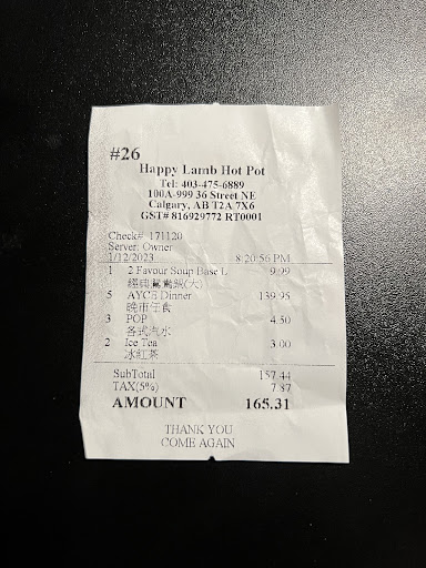 Our ACTUAL correct total 5 PEOPLE AYCE during dinner service ($139.95) + 2 favour soup base Large ($9.99) + 3 pops ($4.50) + 2 ice tea ($3.00) Subtotal is $157.44 Tax(5%) = $7.87 AMOUNT = $165.31