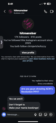 Ā Ā Ā Read moreI was visiting Calgary, and was excited to visit a bar that was explicitly branded towards professional wrestling. So on February 18th, I messaged asking if they were showing AEWās āRevolutionā PPV on March 9th (which is today) and was assured it was. I also saw it was promoted through their Instagram story but honestly cannot remember the date