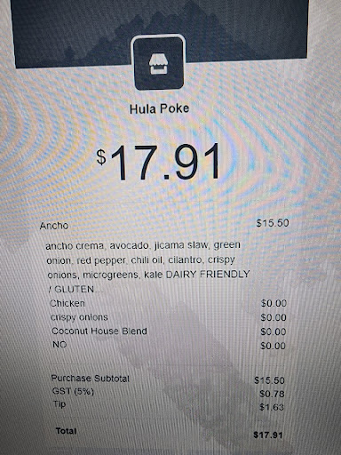 Read moreI have ordered from here at least 4+ times for my entire family and it's so inconsistent. Sometimes the rice is undercooked and hard and chewy in a gross way, sometimes they really skimp on the fish so you're mostly paying for rice and sauce. When you complain, they really don't care. 2 out of the 4 times we've had to throw some of the bowls out. Other times it's actually pretty good, it's hard to find a place that has coconut rice instead of sushi rice for poke. The chips are not bad (portion size is small) and the drinks are pretty good but also expensive.