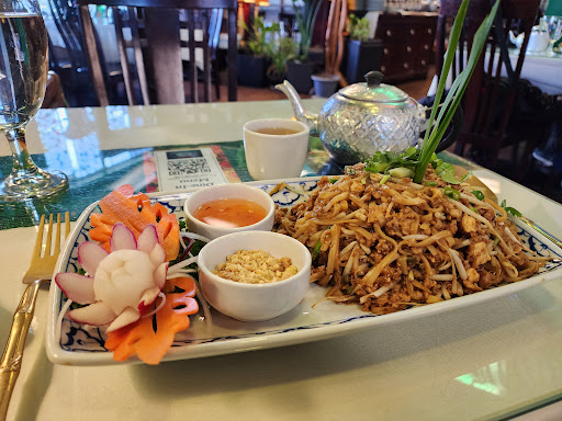 This place was recommended by my friend who is Thai, so I thought I would try it! As soon as you walk it, you are whisked away to some place magical! The atmosphere is amazing and so unique! I usually eat Pad Thai but it can be hit or miss at most places, usually a miss! The only thing I ordered was the Pad Thai without shrimp just as a personal preference. The plating was beautiful, even when I walked in and saw some others food, it looked beautifully plated. The service was great, they are authentically dressed as well. I was very happy, even the water was lemon flavored I believe, was all well done.