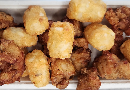 The Karaage Tots consist of fried chicken thighs and tater tots. They are freshly made and absolutely delicious. We ask for sauce on the side, and they always willingly do that...