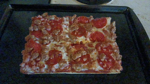 He quickly and unasked, went and pulled a box (with a cooked, ready-to-go pizza inside box) from the glass door enclosed warmer and opened box showing me the pizza crust.