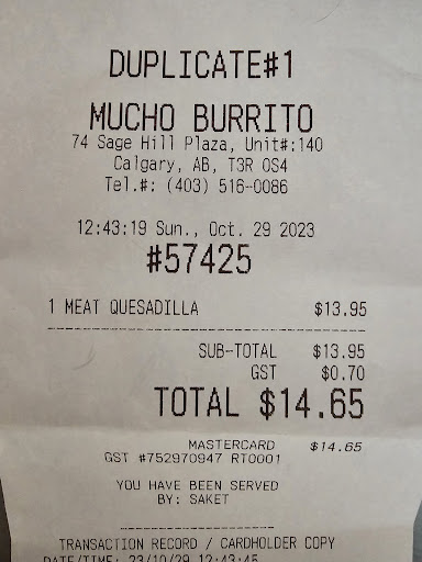I'm visiting from out of province and was looking for something fresh to eat for lunch. I noticed the Mucho Burrito (Sage Hill) when I drove by, so I decided to put in an online order for pickup. I received a confirmation text stating that I would get a text when my order was ready. I ran into a store nearby while I waited. When I didn't receive a text, I walked over.