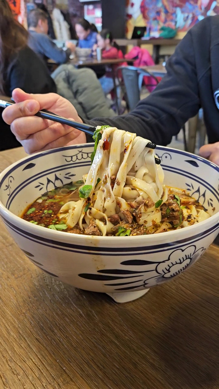 My fierce and I love hand pulled noodles and we live close this location. We saw it on a drive home and thought it would be a great place to try. The atmosphere gets that street food vibe which was fine, everything looked ok and clean. Nice miral on the wall. The service was different. You order online with your phone which was new for us. But the server was there to give us water and our order. She also did inform us that if we’d prefer to order in person with her that’s totally ok too. We thought we’d try there way, something new, something different. It would great.