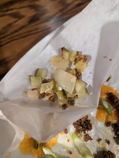 When the nachos came back, everything looked fine, there were no obvious onions, so we began to eat them. Something tasted off about them but we couldn't pinpoint it, until I picked off a green(ish) chunk and tasted it individually. It was a pickle. When we looked closely, there were small chopped pickles ALL OVER the nachos, along with some onions underneath! The waitress came back and asked if these nachos were better. I said no, they weren't, because they had PICKLES on them. She looked confused and said "Pickles? I'm pretty sure that's right, they're supposed to come with pickles" š¤¦āāļø. I told her that's something we would have noticed and would have ordered it without, but she insisted on getting a menu to prove she was right, that the NACHOS came with DILL PICKLES. She went back to the kitchen, then came back to our table and said "the manager will take it off the bill". She did not acknowledge that anything was wrong with the food, take responsibility for her blaming us, or apologize. The pickles were clearly added out of spite, not accident.