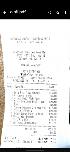 Read moreI have been going to The Original Original Joe's in Kensington and Mardaloop for over 20 years. And I often go to this location, probably about 10 times. A waitress came and took our order, that was the first and last time we interacted, then the male bartender served us for the rest of the evening. I usually order the Beef Dip, Before COVID it cost $17 but 2 weeks ago it cost $21. And I spoke with the bartender about there being a lack of Beef, Beef can't be that expensive to skimp out on it after all it a Beef Dip isn't it. I told him that I have been a loyal customer for over 25 years. And I felt like they were cheating out on the Beef, I suggested to him that they could charge a bit more and add more Beef, the Bartender went and called the manager and told him/her what I said the he returned and said they wouldn't raise the price and instead said that the cook was new and probably didn't know how much Beef it should have had. My friend ordered a pound of wings, but it didn't look like a pound, he said that 8 wings were normally a pound, but I later looked it up online and read that 10 to 12 wings were considered a pound before cooking with equal Flats and drums. I wasn't complaining but instead giving feedback from a loyal customer. The bartender acted professionally and gave me $8 off the bill. I gave him a $20 tip for being Professional and for the good service, but he was on the phone when I put it beside him at the bar, so I didn't get to see his response. I own my own service business and I often receive $100 in just tips from my 3 customers per day total so I like to treat the servers well for good service in return that show me good...
