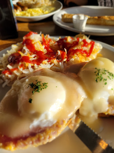 Update: Tried this place out again not too long ago with my family and we had a much better experience. Attentive service even in a busy restaurant on a Saturday morning and 3 out of 4 plates were great. 2 orders were eggs Benedict and one was made correctly and one the eggs had to be remade and then still weren't made right the second time but he just ate them anyway. Mine was made well. My kids food was great everything looked good and they enjoyed it. The creamer container was clean this time lol. Way happier with our last visit. ... The hostess was awesome. The server took a LONG time to come to the table at first. My first attempt of poached medium was poached extra soft and I said so right as I cut into it and they remade that quickly and well. I asked for it to be on a waffle for the extra charge option they have on the menu and didn’t get that. Some of the fruit looked kinda old. Like it has been precut a day ago and wasn’t sealed well enough in the fridge. Specifically the orange slice, watermelon and kiwi. 1 of the dollar pancakes for kids was cooked perfect and plated nicely. The second one was kind of haphazard. The coffee creamer container had dried out cream on the bottom that was obviously there for a while. The bacon was good, the hashbrowns were decent, the Benedict the second time around tasted great even though it wasn’t on the waffle. I actually liked their English muffins anyway. The server became more attentive after second plate came out but never asked me if I needed more coffee or kids refills or anything, I asked for water which she got quickly. She cleared just my plate quickly after I finished while the kids were still eating but then never came back again so I went to the front to pay. Meh. I have a soft spot for Phil’s chain restaurants thanks to core memories from childhood. But this location was kinda...