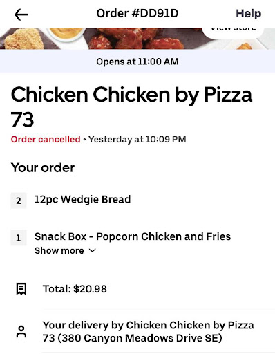 Read moreJust went back to this location after I was given a $50 credit from my previous horrible experience. Upon pickup the lady was very aggressive towards me asking me what was wrong with my order and why I have a $50 credit. She then stormed off to make my food, which took 40 minutes once again instead of the 15-20 minutes as stated on the phone order, so I was waiting in store for 15 minutes yet again. Once again received the wrong chicken sandwich. I got a classic chicken sandwich with pickles instead of the buffalo chicken sandwich I ordered. When I confronted her about it she picked the pickles off the sandwhich In front of me and put banana peppers on instead, and said they didn’t have any cheese so that’s all she could do. She then told me next time to call them directly instead of the call centre to place my order. How the heck do I do that?! When I go to call pizza 73 it’s the generic 273-7373 number, not the specific number for that location. Again another awful experience from this location. The old lady working there seriously needs to learn customer service or she should stop working in the food industry. To top it off, when my wife just went to heat up the left over pizza from the other day she noticed meat in her vegetarian pizza. Was supposed to be a cheese pizza with olives and feta cheese, instead they added tomatoes and what appears to be...
