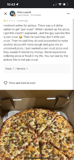 I attached a picture of my previous review 9( o could rage this -20, I would. So unprofessional /‘d borderline running scam. I called on and asked for the 14.99 deal on the sign… I got feta, pepperoni and sausage… I also paid 2.99 to upgrade to thick pan crust once again… this is the garbage I got.. once again people, this isn’t pan crust 😂😂 You can’t charge extra for pan crust and then give people thin crust and act like they are crazy. What a joke. Also when I arrived to pay BF or my 14.99 3 topping deal… they tried to charge me over 21 dollars and said that I should have noticed only vegetables were the toppings on the sign 😂😂😂 That’s just plain false advertising. The pizza tasted like crap and they didn’t even add the feta. They also wouldn’t give me the pizza for the advertised price. This place is a scam and a joke. They will be out of business in no...