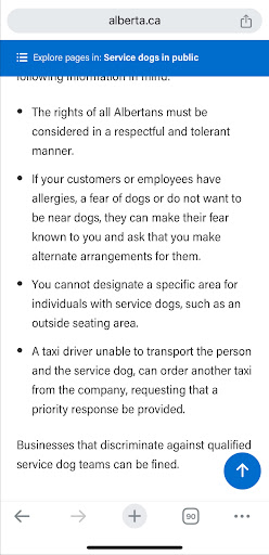 Read moreMy friend and I went to Rising Tides Taproom yesterday for a drink and some food. My friend has a service dog in training, when we entered the empty establishment we were greeted and then told dogs are not allowed because they serve food, we politely told the worker that she’s a service dog in training and is allowed anywhere the public is allowed, he repeated that they would not allow dogs in the establishment and we were welcome but had to go outside. We ordered drinks and went outside, asked for menus which they brought to us and then we sat for at least 20-25 mins without anyone returning to take our food order. Again, there were zero patrons in the establishment needing served but 3 workers all just standing around talking. We decided to just pay for our flights and leave. I suggest the owner or manager freshens up their staff on the rules of service dogs. By refusing a service dog you are refusing a disabled person. I’ve added photos from the alberta.ca website regarding rules around...