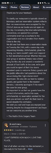 Read moreBe warned that you may come for a beautiful Porterhouse and get turned away without notice. So when they have a private event such as the Rotary club you would think that they would block off their online reservation service, but no they still let you reserve a table that doesn't exist. Or perhaps they would put a sign on the door advises the resturant is closed before you climb the 30 stairs to the reception desk, but no why display the slightest common courtesy to your patrons. No they much prefer you make a reservation and climb 30 stairs and get to the reception desk, to then be told you aren't from rotary come back tomorrow. This is supposed to be the premier steakhouse in Calgary, and they can't even take the time to shutdown their reservation system or put a sign on the door for a private event.