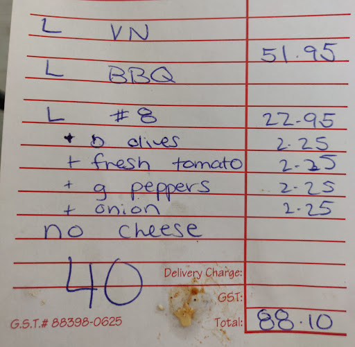 Read moreSammy seriously cares about his customers and what they eat. His work ethic and desire for quality is truly commendable, with a great attitude and seemingly good work atmosphere (I can't say for certain because I haven't worked for him, but there is an open window into the kitchen). The place in always clean and very aesthetically pleasing, a great place to either stay and eat (at least for aesthetics as mentioned previously, the location I know is rather small) or wait for your order. The staff are always friendly and quick, as well as very professional. When it comes to the pizzas, Sammy doesn't skimp on the quality. As a vegan I find it hard to find a good place for pizzas, but Sammy's is the best I've encountered. At most places ordering without cheese leaves the pizza looking quite bare, Sammy actually loads it with all you could want, and you probably wouldn't even guess there's no cheese if you just looked at it. I have a personal story that also shows his commitment to giving the best to his customers. While my mom was ordering in for pickup, she thought to ask if they would accept a bag of our favourite vegan cheese if we bought it fresh from the store and unopened. They did and after running to the store to grab some Sammy cooked it far better then I've ever been able to! So Sammy really cares about what he's giving to his customers and the quality of it while also being open to all kinds of customer requests (just don't go badgering him about every little thing, the man...