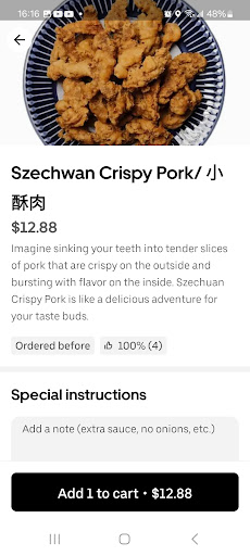 Read more-BEWARE! $70 FOR LITERAL TRASH!! 4 orders of smoked chicken, 2 marinated.. got 4 orders of 1/2 chicken CARCASSES only BONES no meat. Looked like someone ate it before we got it!! NO JOKE! Not enough meat to feed 1 person if you picked at all 4 orders! - Szchewan Pork was overcooked and dried out and hard as a rock. -Black sugar rice pudding had no rice no pudding only a bowl of cold gelatinous liquid..Stock? with a couple of red beans on the bottom, sesame seeds on top. Not a proferred peanut to be seen. WORST THING I EVER ORDERED ON UBEREATS and they are in your Best of Uber list???? And no refund for this? THEY SENT THEIR GARBAGE LOOK AT THE PICTURE OF WHAT WE GOT VS THE MENU ALL BONES. I think they cut off the meat and sent the bones by mistake instead? Sure not something to share with the family or a BBQ like the description said. And UberEats won't give a refund 😢