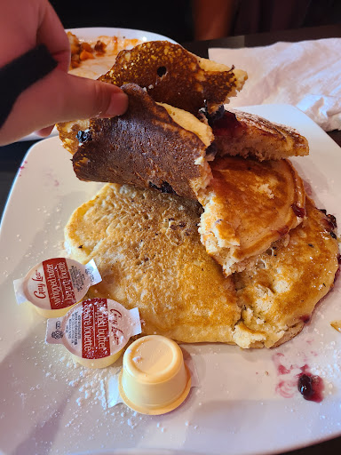 The food wasn't terrible. They give pretty generous portions for the amount of money you're paying. I asked for my hash to be extra crispy, which they did. It was pretty tasty but my over easy eggs looked like they were cut in half and over cooked. My boyfriend got an omelet which wasn't half bad. The refills on coffee were slow but steady. The blueberry pancakes LOOKED okay but when you lift the underside, it was pretty dark. I think the pancakes were overcooked. They were tough, weirdly chewy and dense.