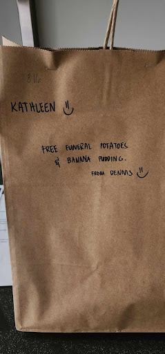 I place my order with Door Dash and await my dinner. The bag shows up and I was quite shocked about the size of the bag as I had only ordered 2 things and a drink...I picked up the bag and read a note that said " Free funeral potato's and banana pudding from Dennis" I am sorry....WHAT?!?!