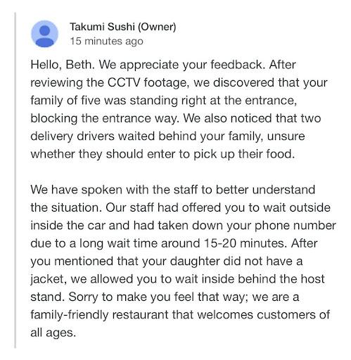 we were told by that rude staff that the wait was going to be 2 minutes (and after she said 2 minutes, she added “I just need to clean a table and move some things around, it will be quick”), hence it makes no sense to make us wait outside. I hope your cctv has sound so you can hear it. Also, there were many other customers after us (after we were seated) that stood and waited at the same spot - not sure why that was ok for them? Maybe because they didn’t have kids with them.
