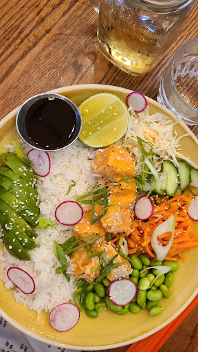 Great vibes. Great entertainment as you dine. Lots of tables. HOWEVER, I'm disappointed by what I ordered and I honestly think I just unfortunately ordered the wrong thing. I should've gone for something classic like a burger and fries but instead I went for their salmon poke dish. Let me warn you, if you love poke or even if you love rice, DO NOT order the poke bowl. I'm confident they do well with their other dishes and before going here I've heard so many praises. They have a great menu selection, don't settle for the 1 dish that would leave you wishing you just stayed home and had a bowl of instant noodles instead. I would love to come back to try something else on the menu, but maybe after I get over the horror of how they made the rice. Let me explain. I also have pictures. The one great thing about the salmon poke is actually the salmon, thankfully. It's lightly seared, and fresh and flavourful. Everything else? Meh. The sauce is literally plain old soy sauce. Nothing special. No other seasonings or sauces. You get a bowl layered with rice on the bottom, and then some veggies, avocado, and the salmon. Other than the salmon it's all plain + soy sauce. but it gets worse. THE RICE. What is up with this rice? I'm no rice expert but I grew up eating rice everyday and started cooking rice in elementary school and the rice they served me was either undercooked or been cooked and refrigerated and then not properly reheated. It was hard, and grains of it stuck together in hard chunks that--if you were lucky--shattered when your utensil stabbed into it, just to make it...somewhat edible. But this isn't rice. Rice is soft and fluffy, even sticky. This was... a dishonour on the rice farmers who meticulously grew these grains of rice. I just couldn't bring myself to finish it. Again, I'm sure their other dishes are fantastic and as I sat there poking at the dismal rice in my bowl, I had food envy for my colleagues who were smart and ordered the chicken sandwich or a salad. Don't come here for a rice based dish. But definitely do come for the vibes and well, literally everything else. 🥲