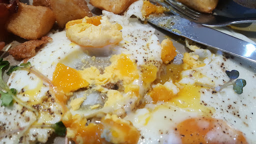 Read moreMy friend and I went here today. From the start when they send you a text that your table is ready, but then stand there for another 15-20 minutes afterwards, somethings wrong. When we went to Benny's they seat you almost immediately. As for the food, I was hoping for better. Wanted to try chicken and waffles at a restaurant, so I ordered it here. Mistake. First the coffee (Fratello). They should highly consider getting their coffee somewhere else. Maybe Tim's just next to them :). It had a weird front taste and a bitter finish. The chicken was flavourless, however moist. The crust was crunchy, points, but had no flavour other than salt and the sauce that came with it was vinegar forward. The white sauce also had no flavour. I could do better. The waffle was alright for what it was, but if I was expected to add that white sauce to it, yeah no. I always have a picture in my head from Southern food shows and think that looks yummy. Bro'kin Yolk, you have a long way to go. Now, if it was tasty, the amount they give you is really questionable, but thankfully, it was a pass. I asked for some maple syrup instead which was very mild and I received a small quantity. As to my friends Benny, she stated that the potatoes where dry, and she thought that the waffle under the egg shouldn't have been so sweet for a Benny. The service was alright, but nearing the end we had 4 different people within a minute come to me asking if I was done, when I clearly wasn't. Somewhat annoying. Whoever the head chef is here, needs to fix a lot of food issues and shouldn't be texting you until you know you can seat them. We also noticed a lot of Jasmine rice in dishes. I don't think this place actually has a head chef with something to say. It isn't Asian fusion by any means, just things haphazardly put together because restaurant. Maybe the other locations are better, doubtful. I would rather go back to Benny's or try some...