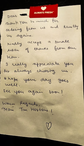 A few days ago I had another Skip order (I am addicted to Tim's 😆) and this sweet note was attached to the delivery bag. Staff added an extra treat as a thank you for staying with them.